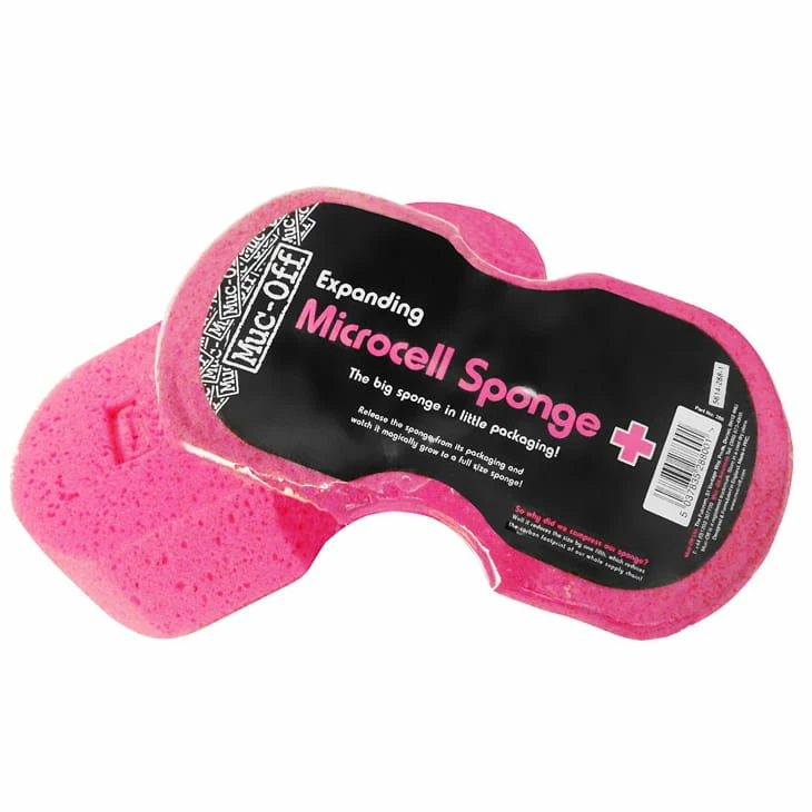 De Muc-Off Expanding Sponge lijkt op het eerste gezicht klein. Eenmaal uit de vacuümverpakking, onthult het zijn ware grootte. De roze spons is perfect voor het schoonmaken van grote oppervlakken.
