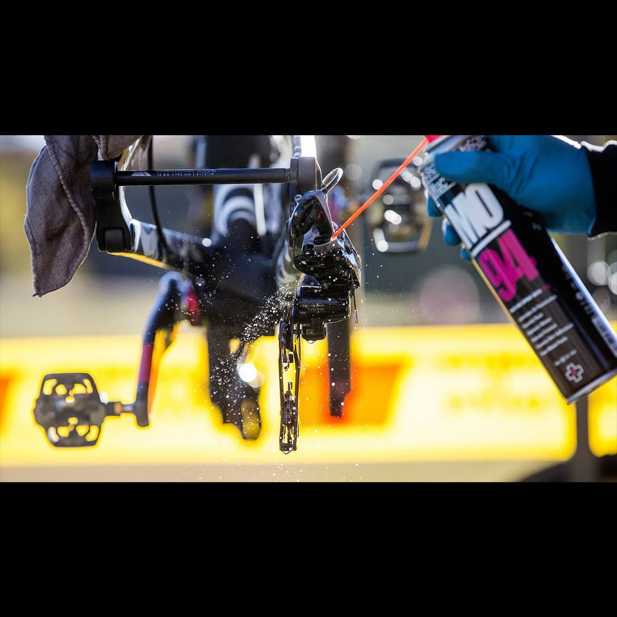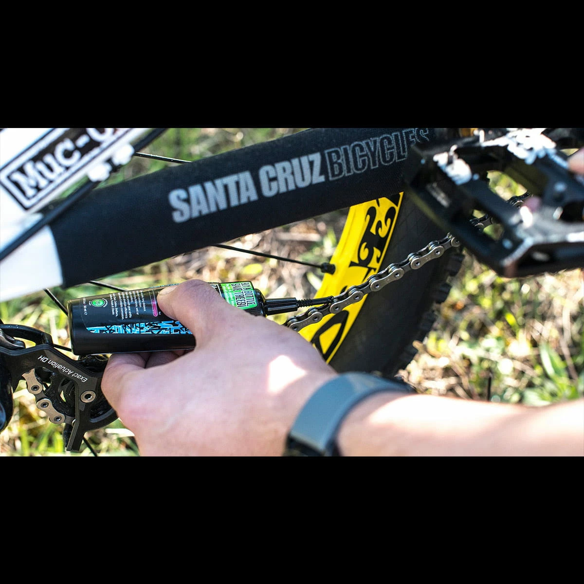 De basisset van Muc-Off: Wash, Protect & Lube Kit: Volledig gevuld met de testwinnaar Nano Tech fietsreiniger, MO-94 conserveringsspray en de beproefde en uitstekende Wet Lube. De Nano Tech fietsreiniger ”Muc-Off Biodegradable Bike Cleaner” heeft een ongelooflijk effectieve reinigingsformule met ‘Nano Technology’ die zelfs de meest gevoelige oppervlakken van uw fiets beschermt. Het bevat geen schadelijke zuren, is CFK- en oplosmiddelvrij en is volledig biologisch afbreekbaar. Muc-Off MO-94 is een echte allrounder. Bewegende delen worden permanent gesmeerd en er blijft een intensieve beschermlaag achter. Het voorkomt dat vocht binnendringt, dat vuil zich hecht en verdrijft overtollig water. Roest en corrosie worden zo op afstand gehouden. De Muc-Off Biodegradable Dry Chain Lube is een extreem duurzaam fietskettingsmeermiddel voor lange afstanden. Het is speciaal ontwikkeld voor lange afstanden. De geavanceerde MUC-OFF formule is gemaakt van natuurlijke ingrediënten en bestaat uit volledig hernieuwbare bronnen en is een biologisch afbreekbaar nat glijmiddel! Het dringt diep door in de kettingschakels en zorgt voor een langdurige smering.