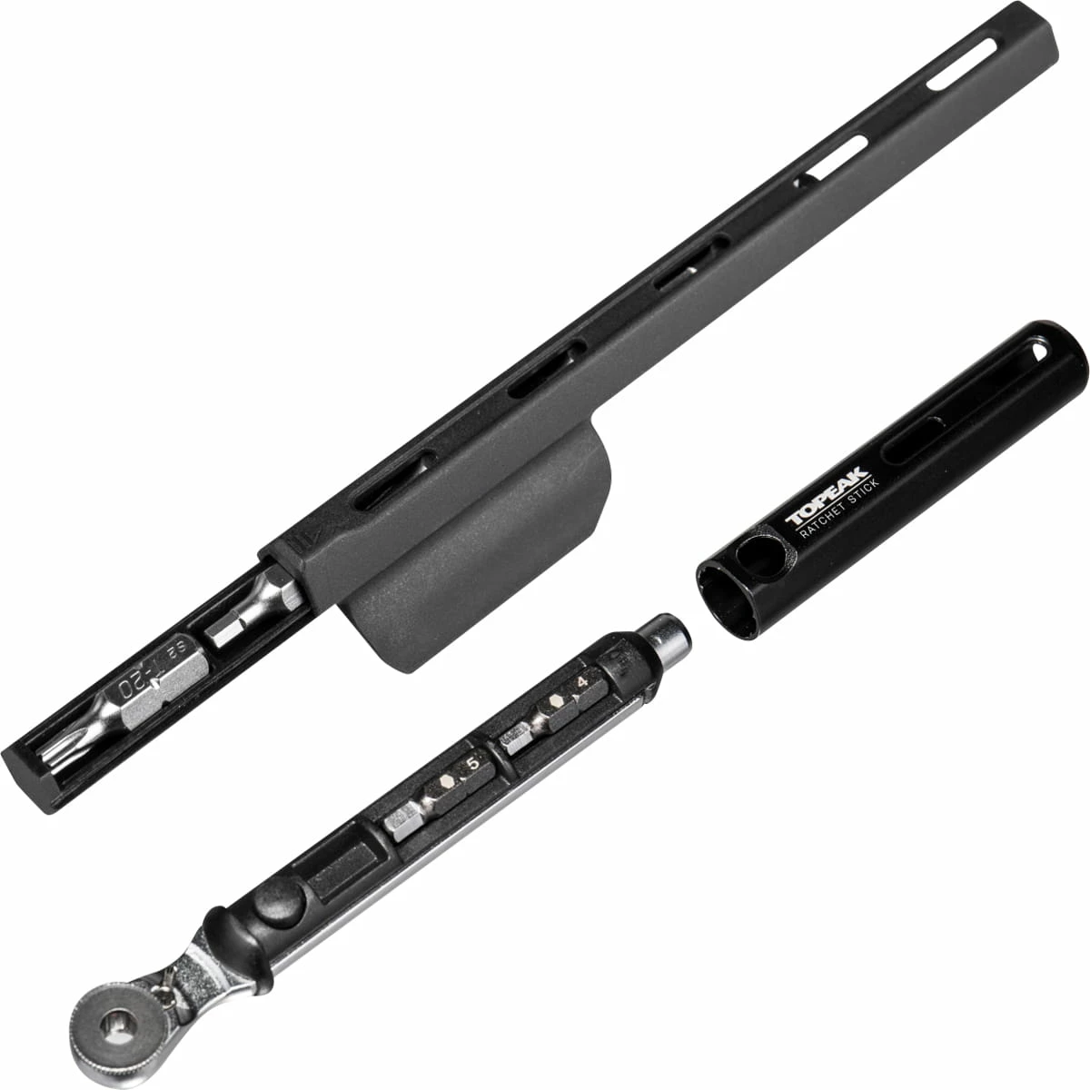 De Ratchet Stick van Topeak biedt een eenvoudig te gebruiken ratelmechanisme en een geïntegreerd opbergvak voor de belangrijkste ratelbits. De Ratchet Stick is gemaakt van hoogwaardig aluminium en is dus licht van gewicht en duurzaam. Een nuttige metgezel voor de volgende reis. De praktische houder voor bijv. aan de muur is inbegrepen.